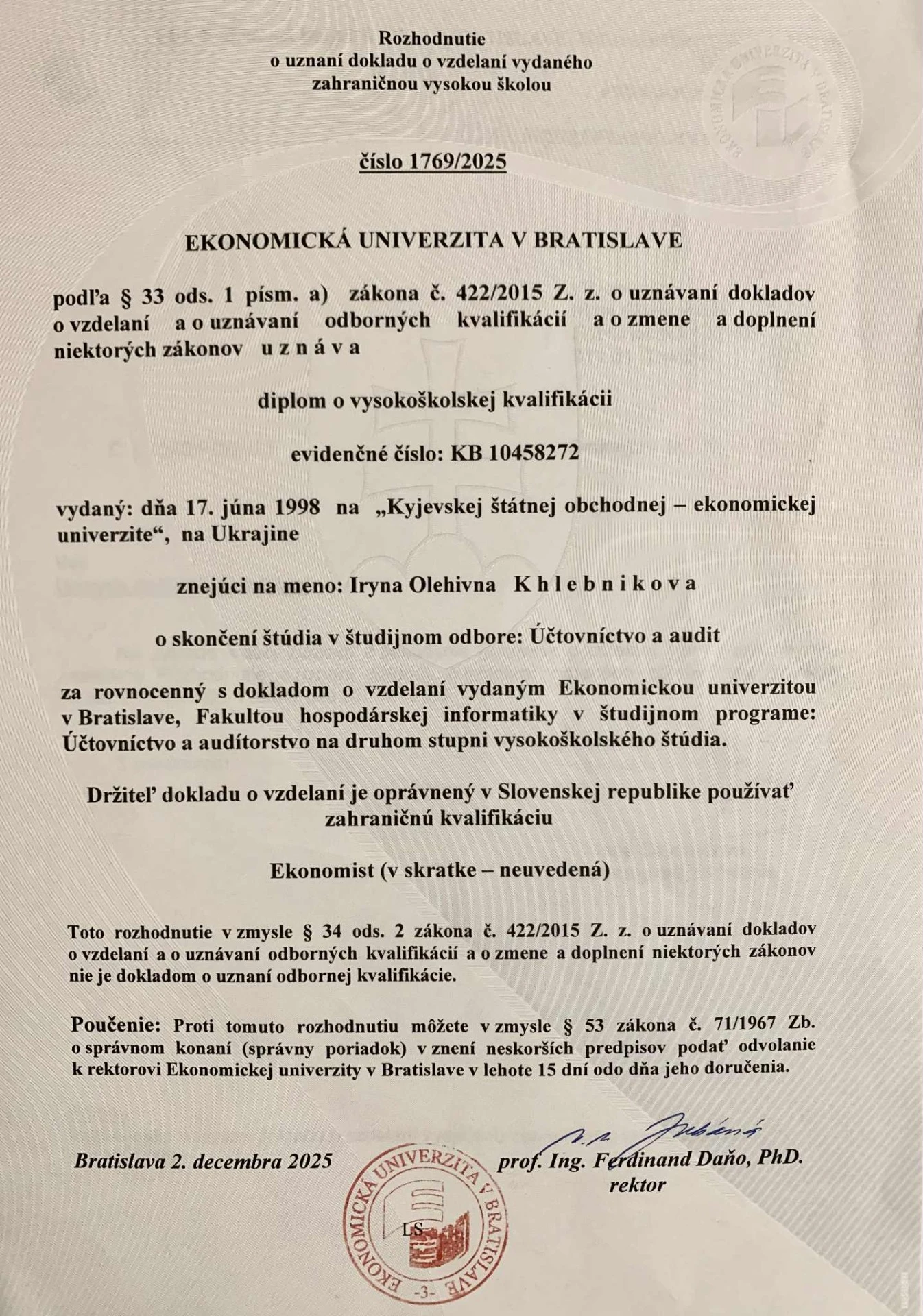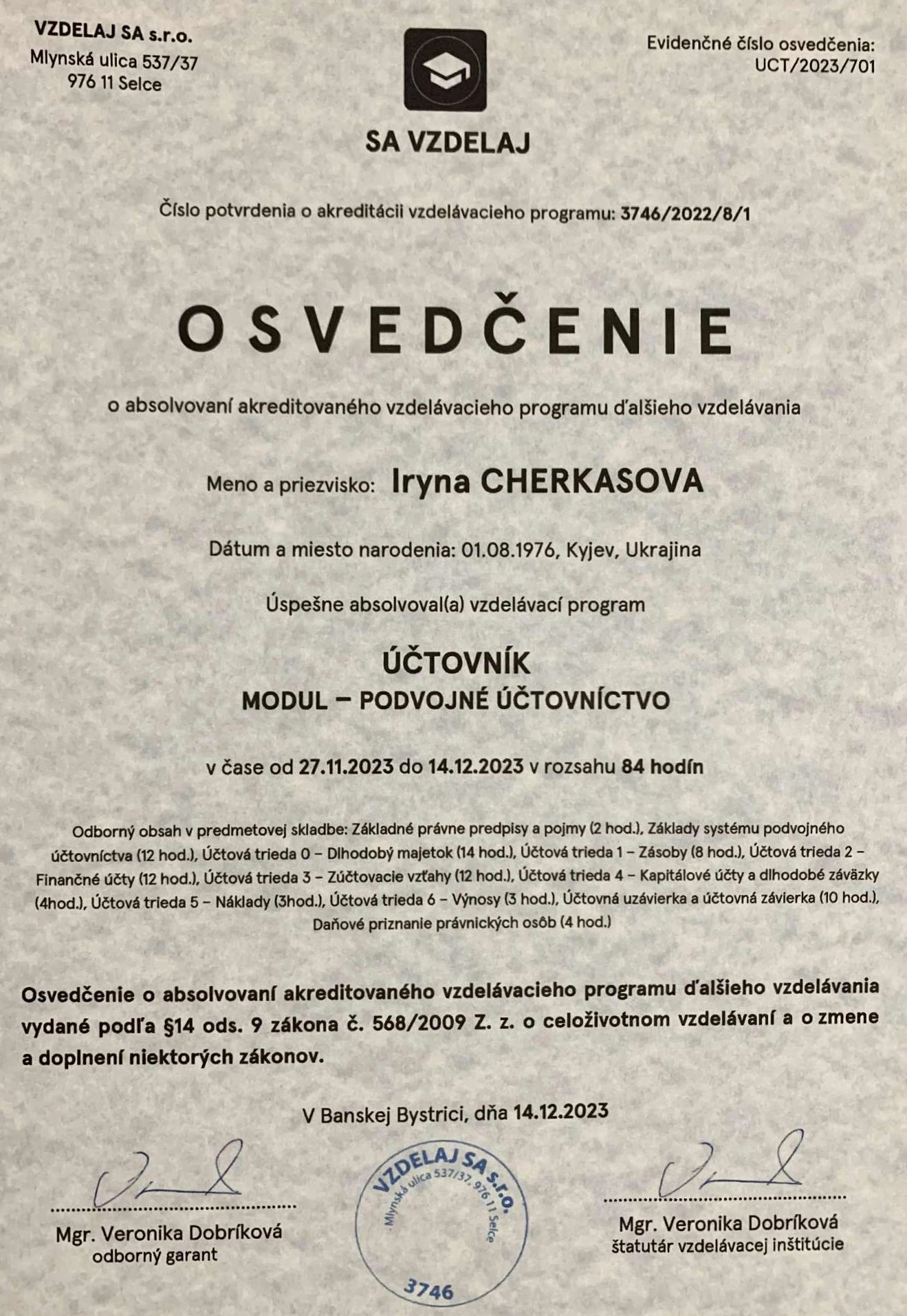 Volám sa Iryna Cherkasova. Pochádzam z Ukrajiny, na Slovensku žijem s rodinou od roku 2014. Vyštudovala som obchodno-ekonomickú univerzitu v Kyjeve so zameraním na účtovníctvo a audit. Od roku 2015 poskytujem účtovnícke služby pre SZČO a od roku 2023 aj pre firmy. Našim cieľom je poskytovať klientom stabilné, presné a spoľahlivé účtovnícke riešenia.